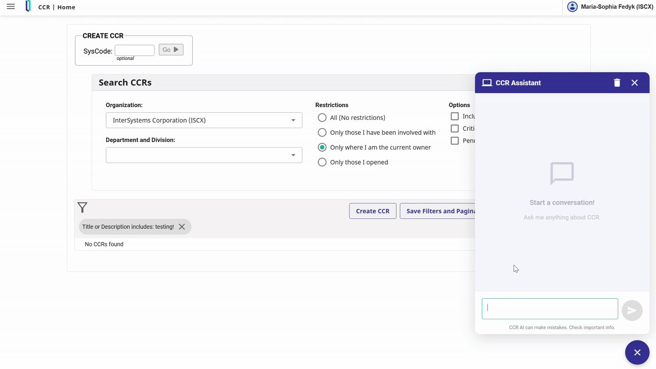 要访问该助手,请点击 CCR 应用程序右下方的蓝色 "打开 CCR 助手 "图标。对话会在浏览器会话中保存,但会在注销时清除。
