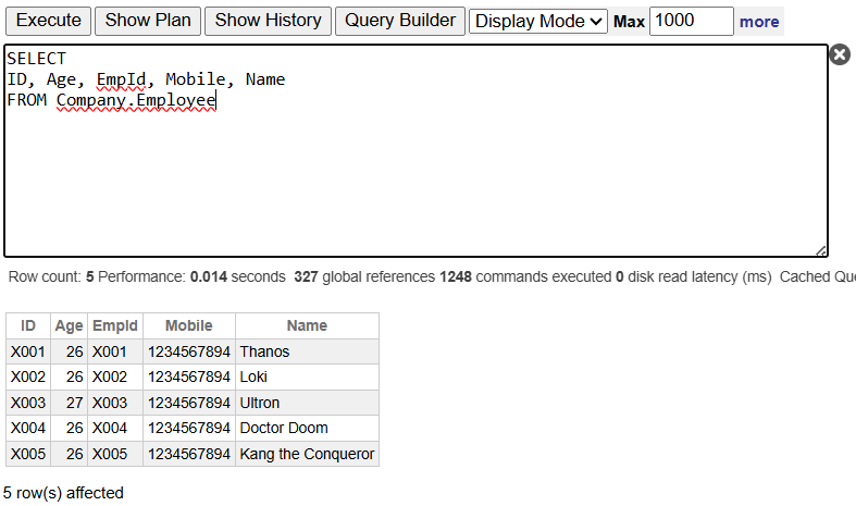SELECT ID, Age, EmpId, Mobile, NameFROM Company.Employee WHERE Age = 26