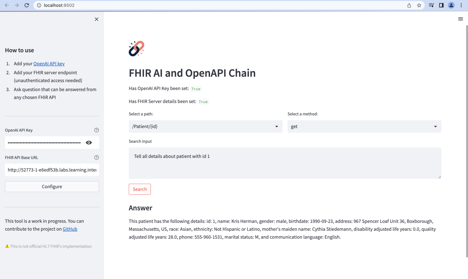 隆重推出FHIR - AI 和 OpenAPI 链应用程序,该解决方案允许用户使用自然语言查询与 FHIR API 进行交互。该应用程序使用OpenAI 、 LangChain和Streamlit构建,简化了查询 FHIR API 的过程并使其更加用户友好。