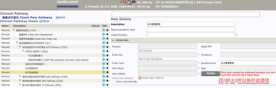 胸痛临床路径中每个环节的任务需要由医生和护士分别完成,例如,患者教育通常由护士完成。但并不能因此将“患者教育”从医生开启的临床路径中移除,否则会破坏路径的完整性。这时,对任务执行人进行限制可以有效解决上述问题。如图4所示,当医生身份登录的用户企图执行“急性冠状动脉综合征(ACS)患者教育”时,系统会拒绝此行动,并提示其拒绝原因。同理,如果护士身份登录的用户企图预约冠状动脉介入(PCI)手术时,系统亦会拒绝并要求以医生身份登录执行。