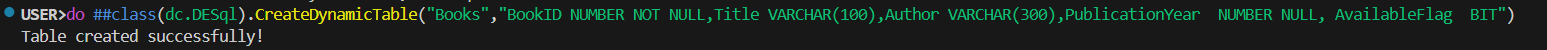 USER>do ##class(dc.DESql).CreateDynamicTable("Books","BookID NUMBER NOT NULL,Title VARCHAR(100),Author VARCHAR(300),PublicationYear  NUMBER NULL, AvailableFlag  BIT")