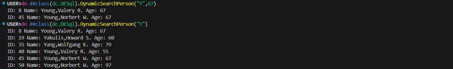 do ##class(dc.DESql).DynamicSearchPerson("Y",67)
