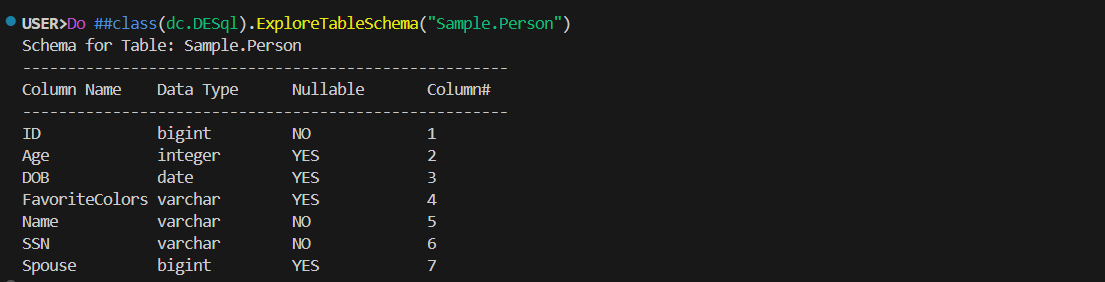 Do ##class(dc.DESql).ExploreTableSchema("Sample.Person")