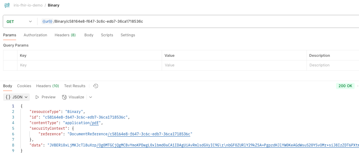 我创建了一个例子,当请求二进制资源时,FHIR 端点会返回一个响应,就像它存在于资源库中一样。