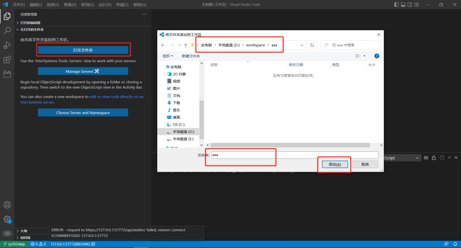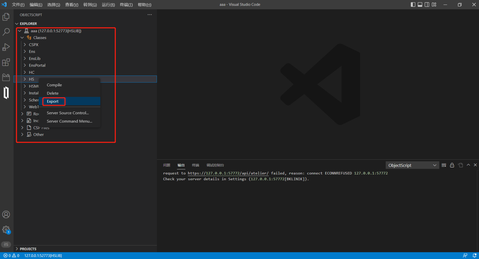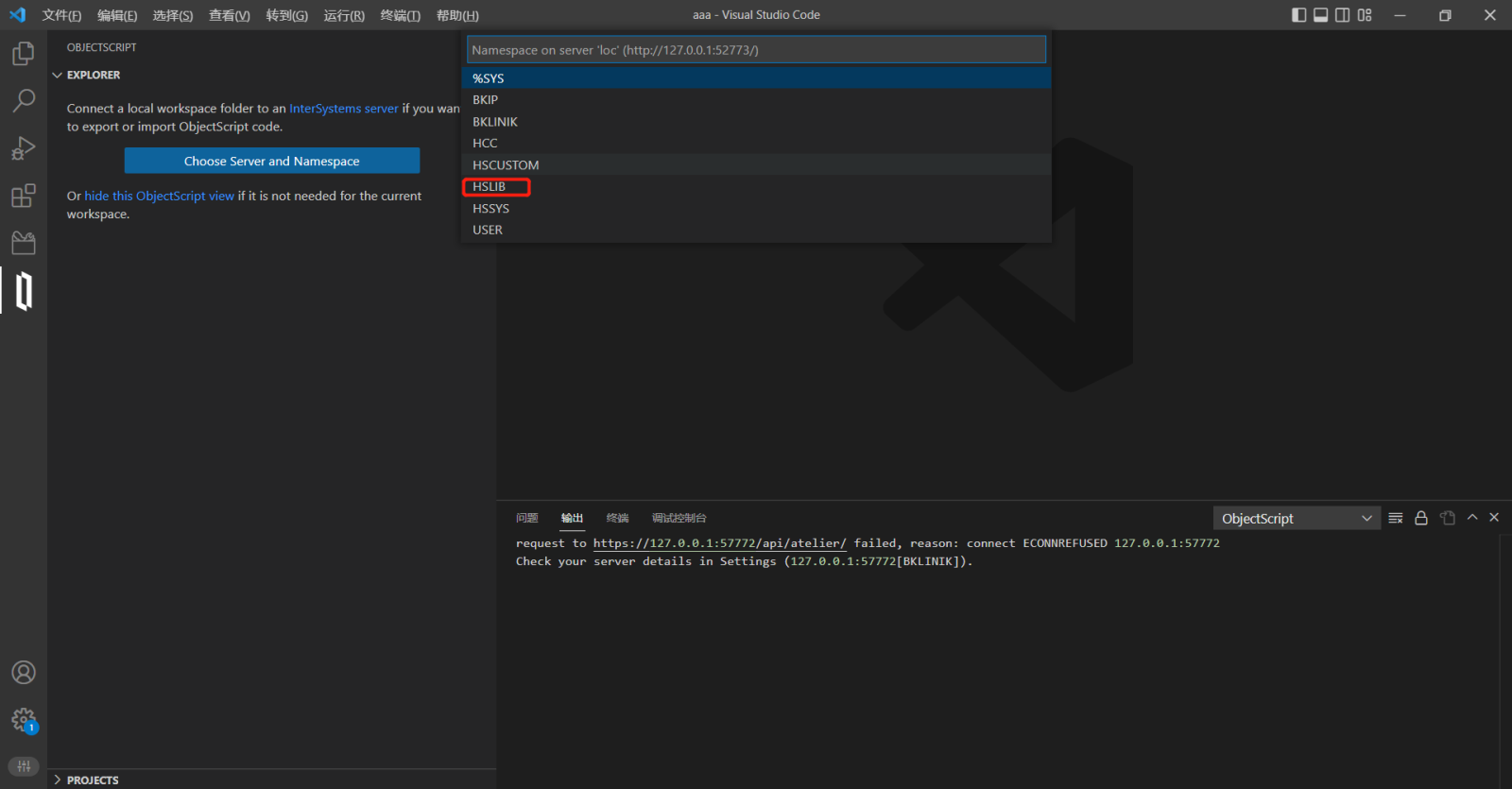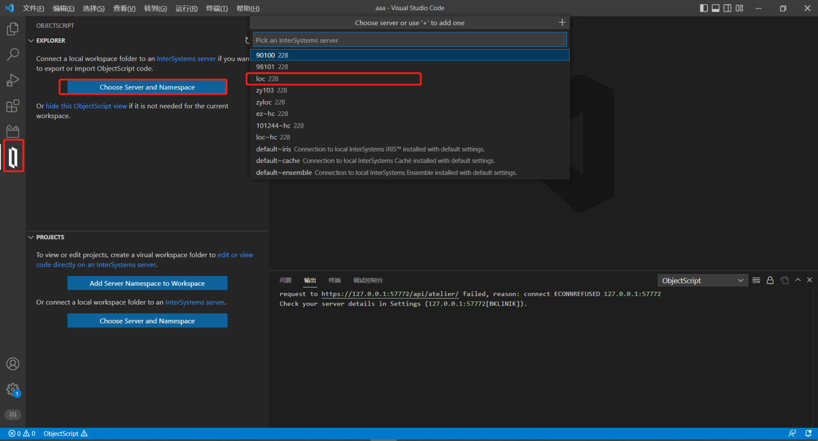 点击ObjectScript – Choose Server and Namespace – 选择对应的服务器