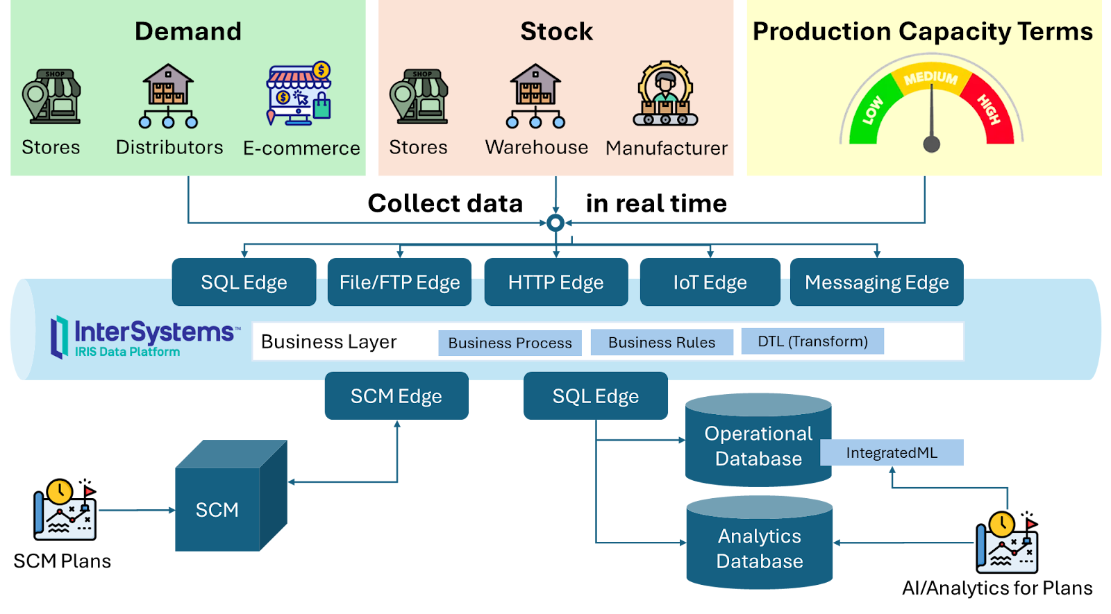 从商店、电子商务平台、仓库和工厂系统中的 Kafka 和 MQ 主题收集有关订单、库存和占用产能的数据。