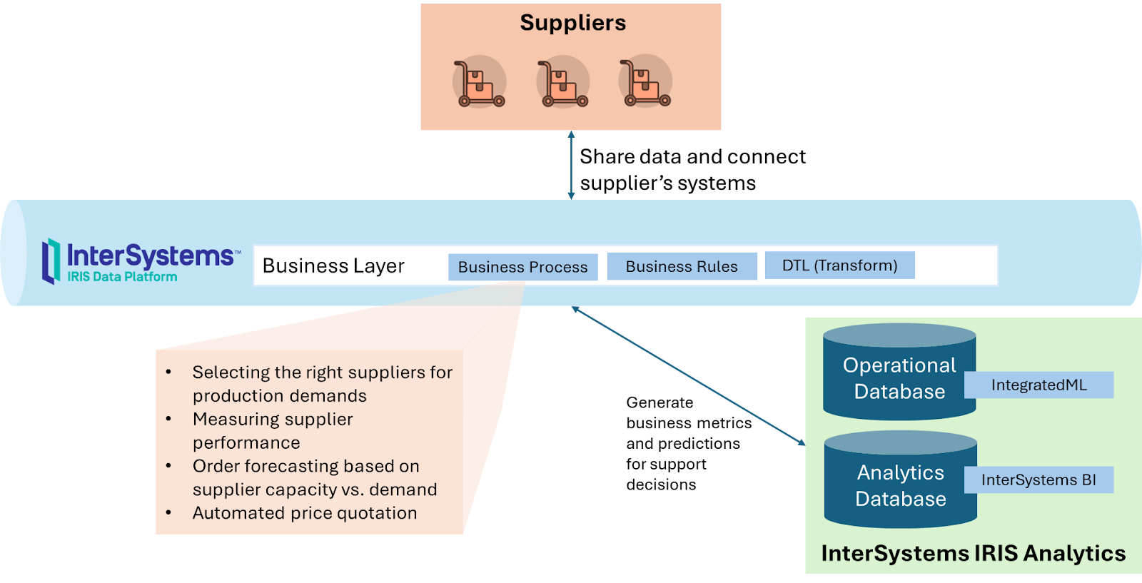供应链是指由公司业务领域及其供应商和合作伙伴(利益相关者)执行的一系列流程和活动,从原材料采购、生产到交付给最终消费者。利用 InterSystems IRIS 的协调功能,供应链管理解决方案可以更好地管理供应链: