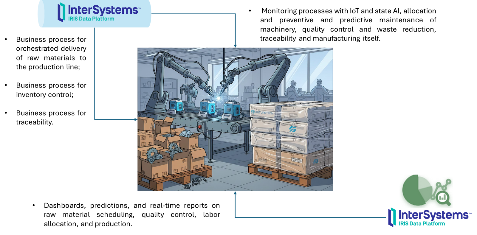 主要活动包括从生产计划开始,然后分离原材料、组装生产线、准备和维护机器、进行生产、执行质量控制以及包装发货。这些活动的自动化程度很高。因此,InterSystems IRIS 成为了基础:
