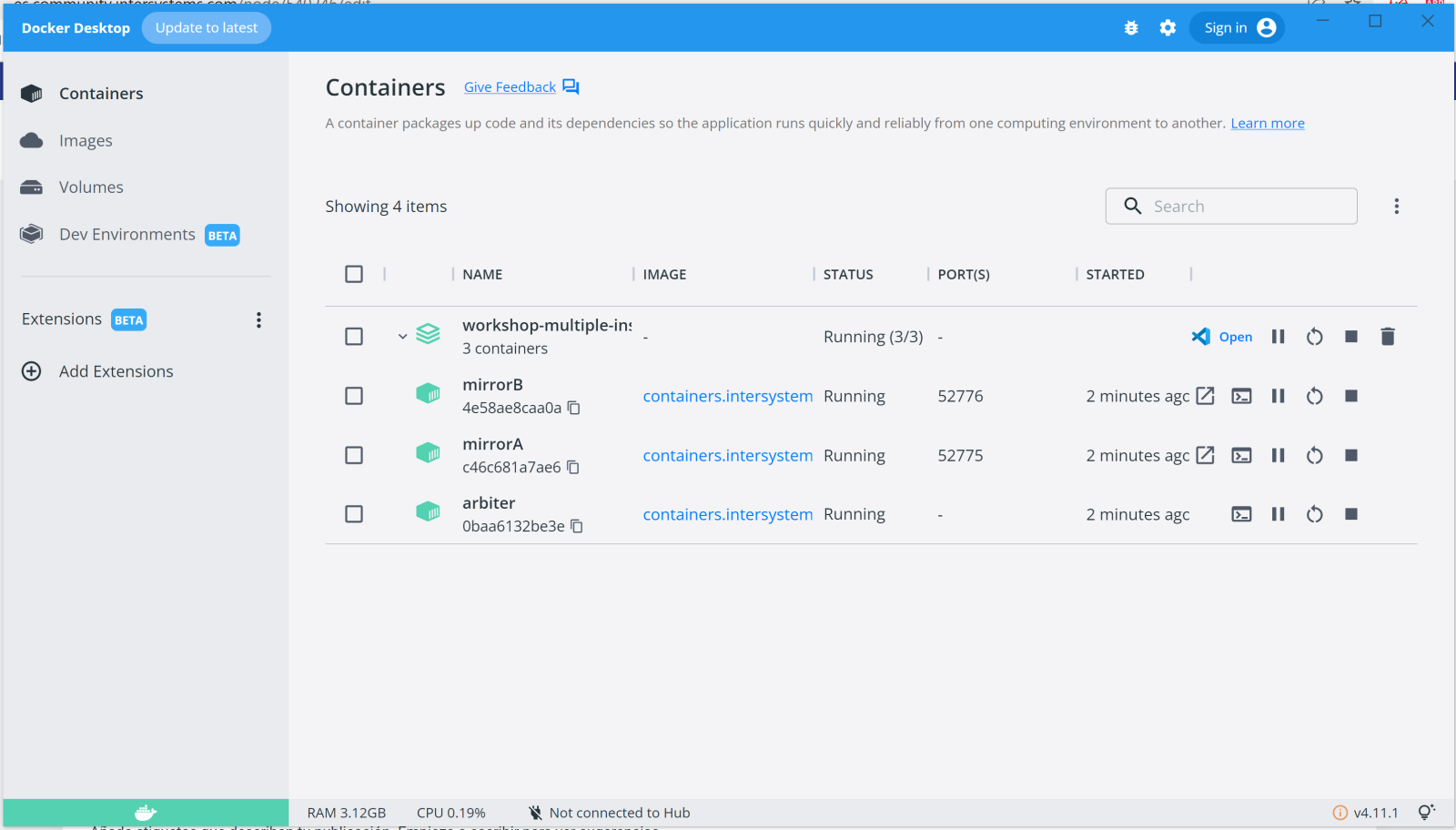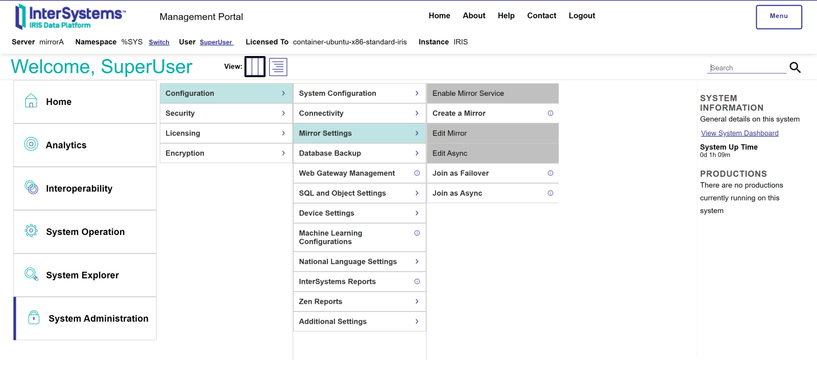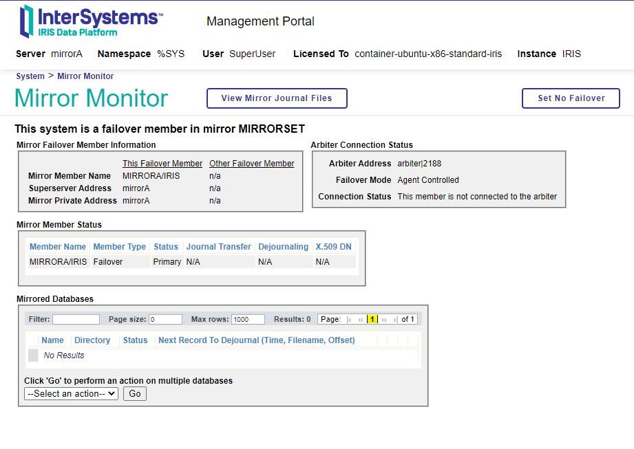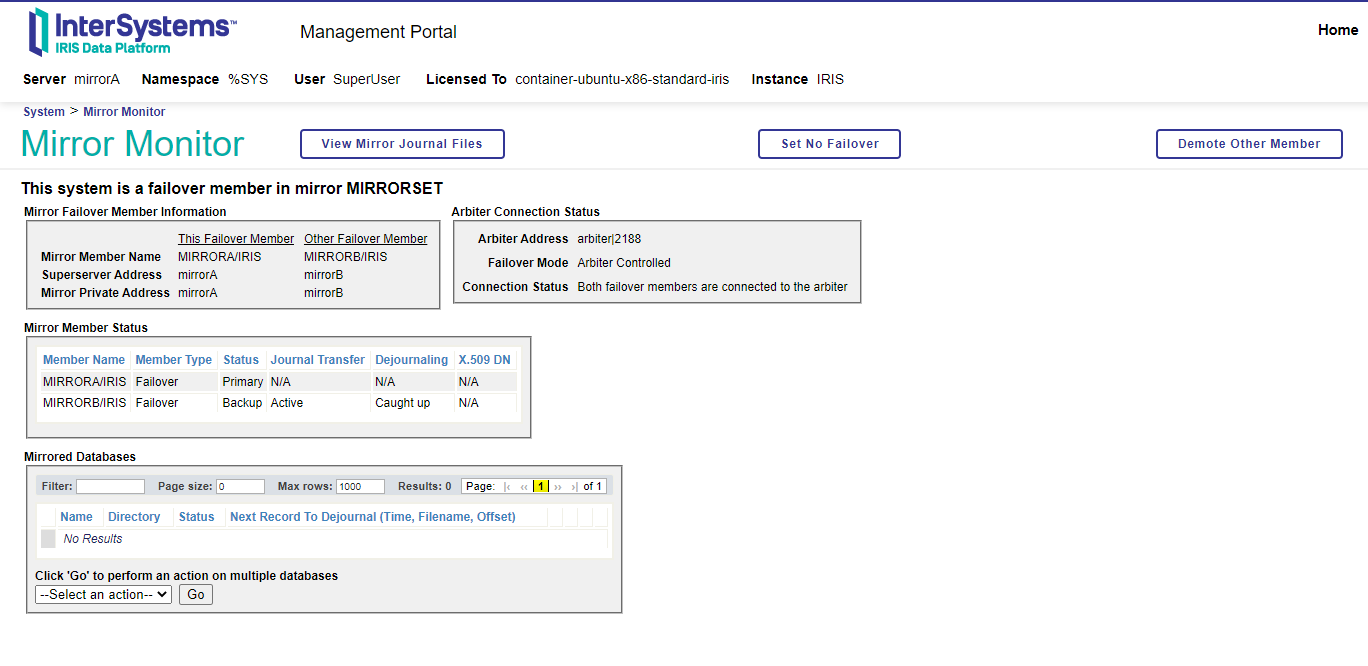 部署容器后,我们将继续访问我们将在镜像中配置的实例,第一个将在端口 52775 ( mirrorA ) 上侦听,第二个在 52776 ( mirrorB ) 上侦听。访问用户和密码将是superuser/ SYS
