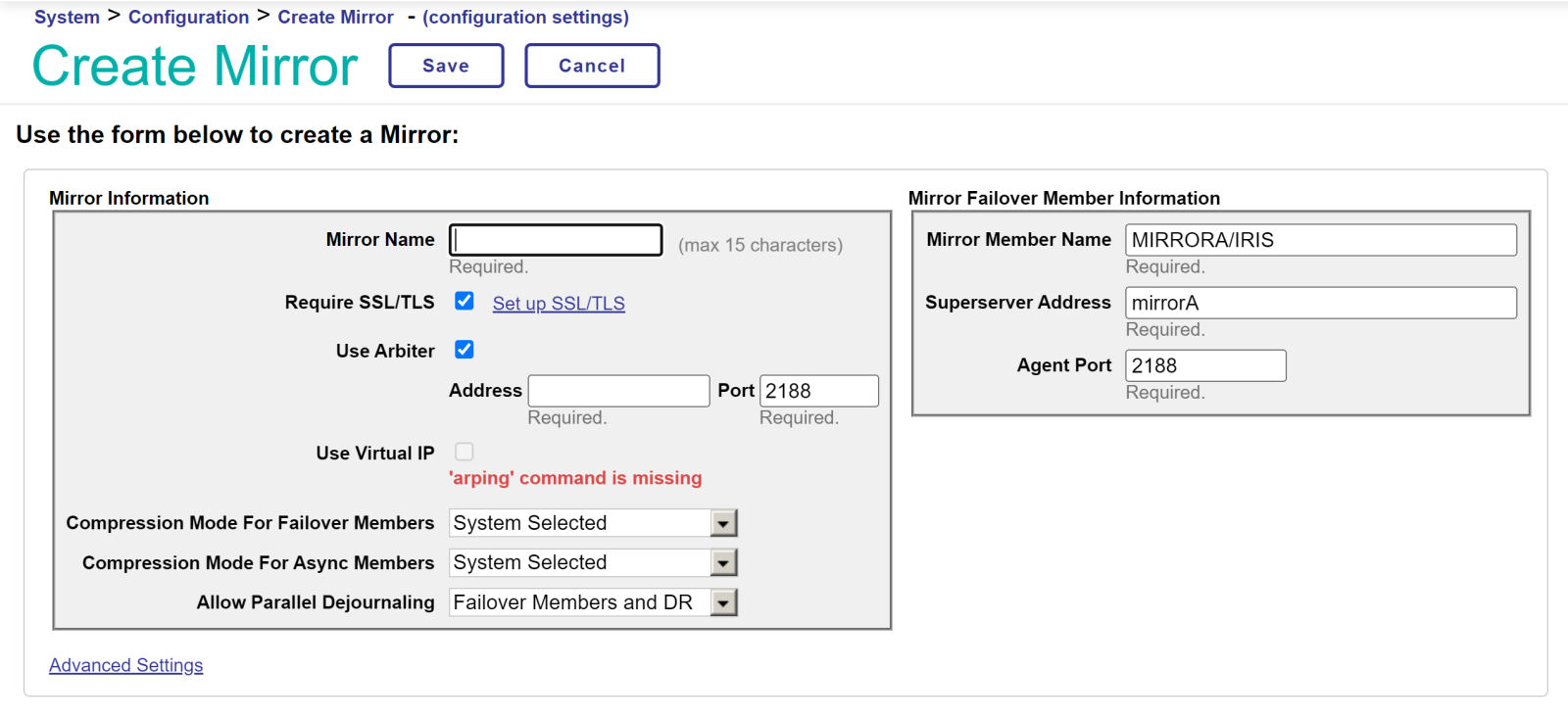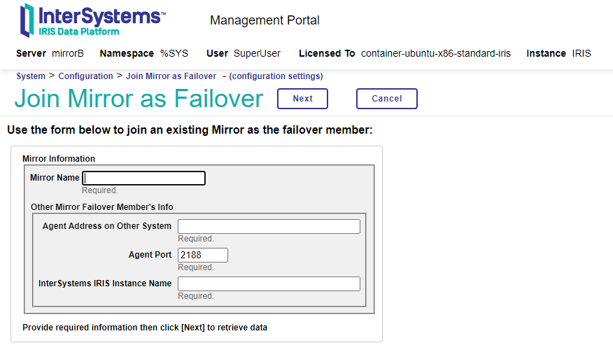 在这种情况下,由于我们还没有创建任何镜像配置,我们必须使用Create Mirror选项创建一个新配置。当我们访问这个选项时,管理门户将打开一个新窗口,我们可以从中配置我们的镜像: