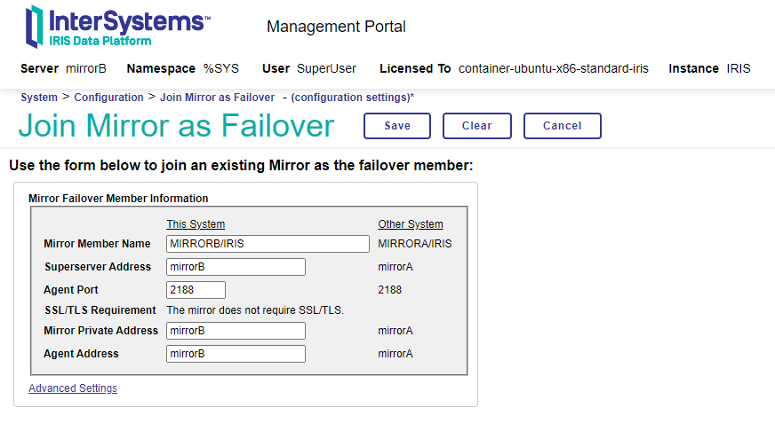 完美,这里我们有了新配置的镜像。如您所见,只有我们刚刚创建的活动节点出现。很好,接下来让我们在故障转移中添加我们的被动节点。我们访问mirrorB管理门户并访问镜像设置菜单。正如我们已经为mirrorA实例所做的那样,我们必须启用镜像服务。我们重复该操作,一旦菜单选项更新,我们将选择Join as Failover 。