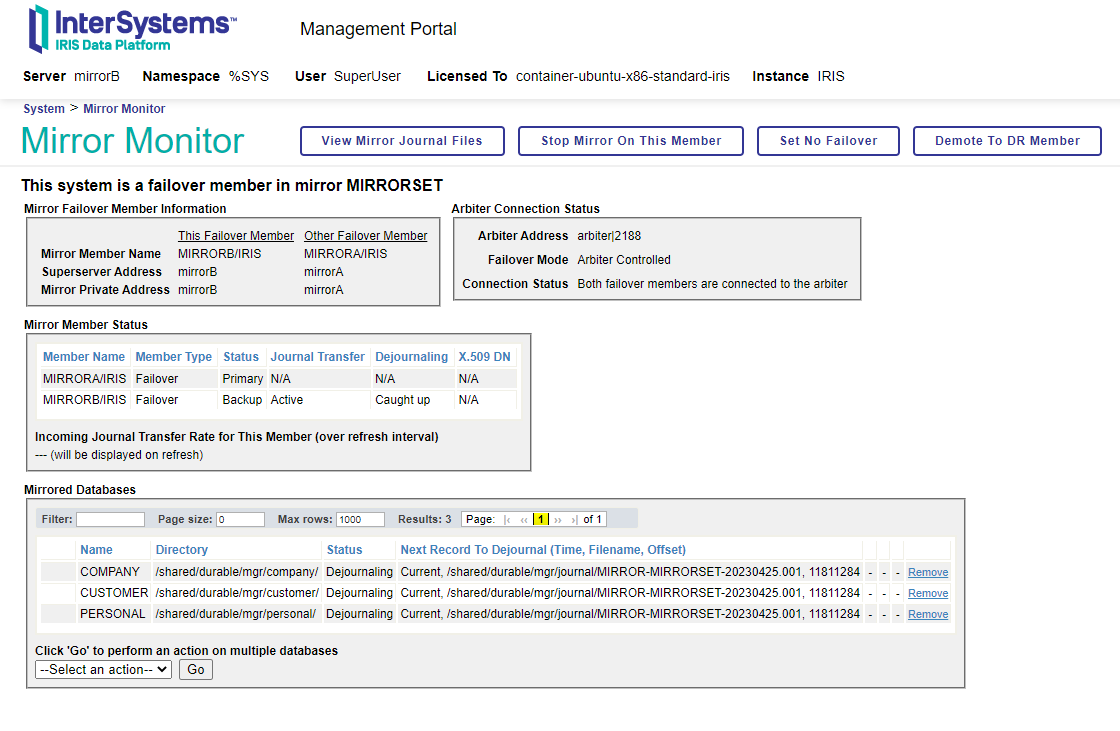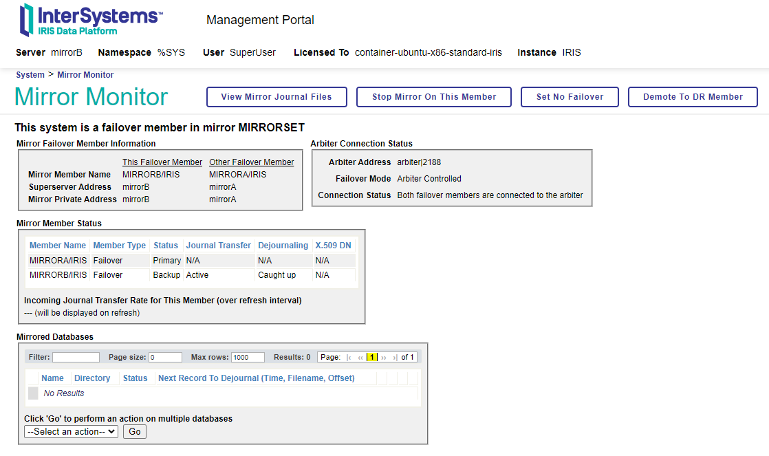 - mirrorB :将部署 IRIS v.2022.1.0.209 镜像的容器,稍后我们将其配置为辅助故障转移节点。