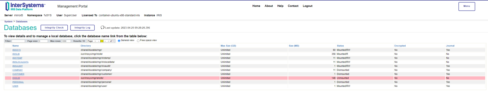 正如我们所看到的,从被动节点我们被告知,虽然我们在镜像中配置了 3 个数据库,但配置尚未完成。让我们继续将数据库从主动节点复制到被动节点,不要忘记我们必须卸载被动节点的数据库才能进行复制,为此我们将从管理门户访问系统配置—— >数据库并访问它们中的每一个,我们继续卸载它们。