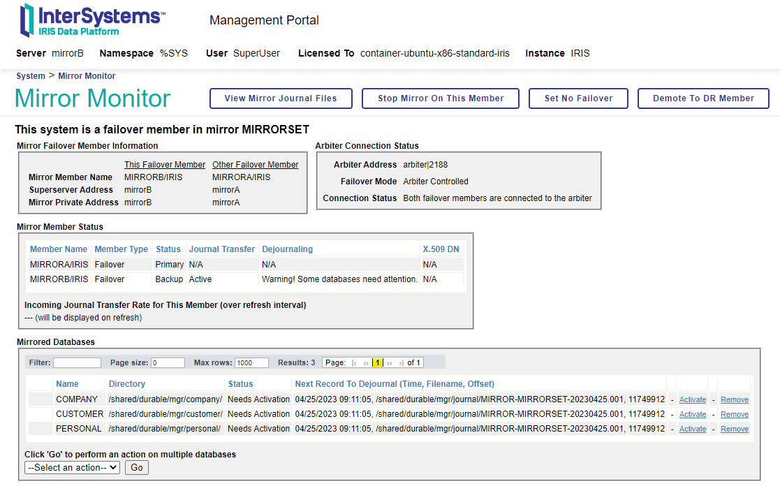 一旦我们将数据库从主动节点添加到镜像中,我们必须对其进行备份或复制数据库文件 (IRIS.dat) 并将它们还原到被动节点上。如果您决定直接复制 IRIS.dat 文件,请记住您必须冻结要复制的数据库中的写入,您可以在文档的以下URL中查看必要的命令。在我们的例子中,没有必要暂停,因为除了我们之外没有人在写入数据。