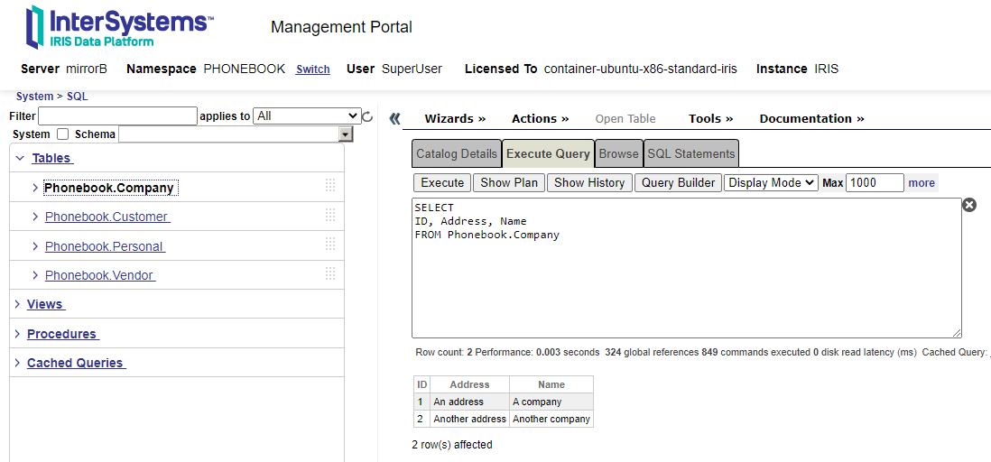 公司数据将在COMPANY数据库中注册,联系人数据在PERSONAL中,这两个数据库都已映射,以便可以从命名空间 PHONEBOOK 访问它们。如果我们检查两个节点中的表,我们将看到在mirrorA中我们有公司和联系人的数据,但在mirrorB中仍然没有任何数据,这是合乎逻辑的。