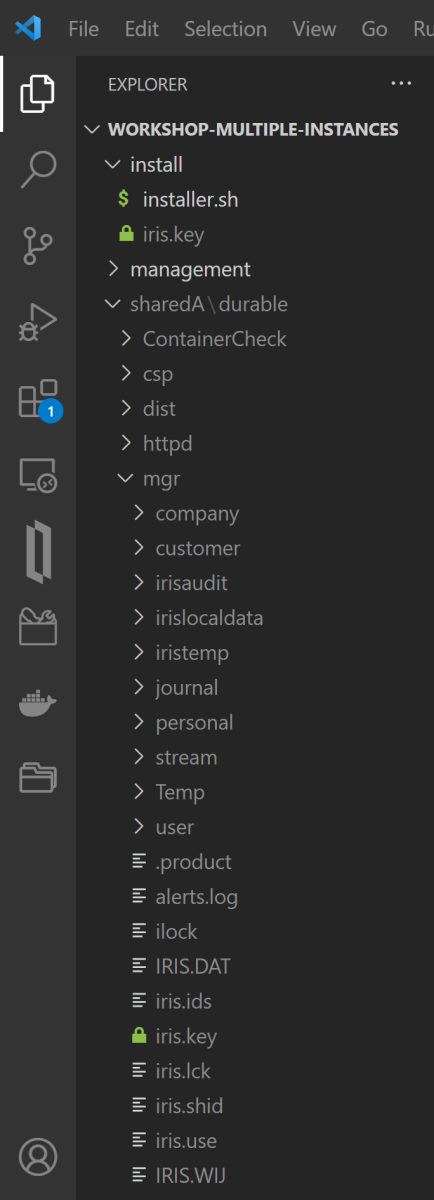 完美的!卸载的数据库。让我们从 Visual Studio Code 访问与本文相关的项目代码,看看我们有 IRIS 安装所在的文件夹, sharedA用于mirrorA和sharedB用于mirrorB 。让我们访问 COMPANY、CUSTOMER 和 PERSONAL 数据库所在的文件夹 ( /sharedA/durable/mgr ),然后继续将镜像中每个数据库的 IRIS.dat 复制到 mirrorB 的相应目录 ( /sharedB/durable/mgr) ).