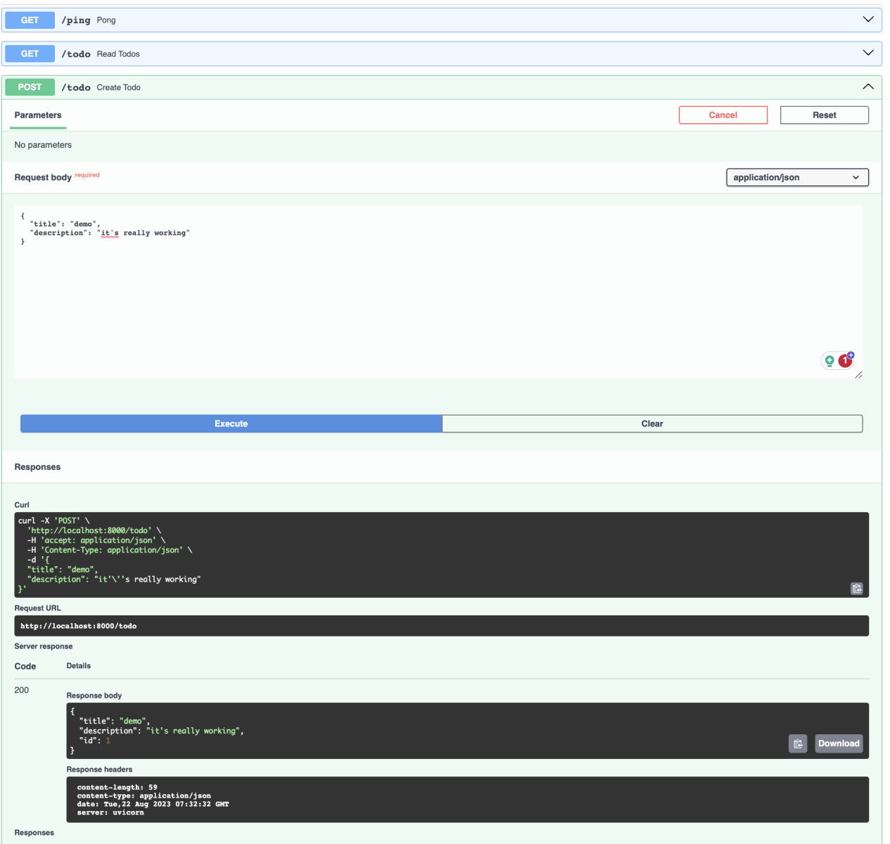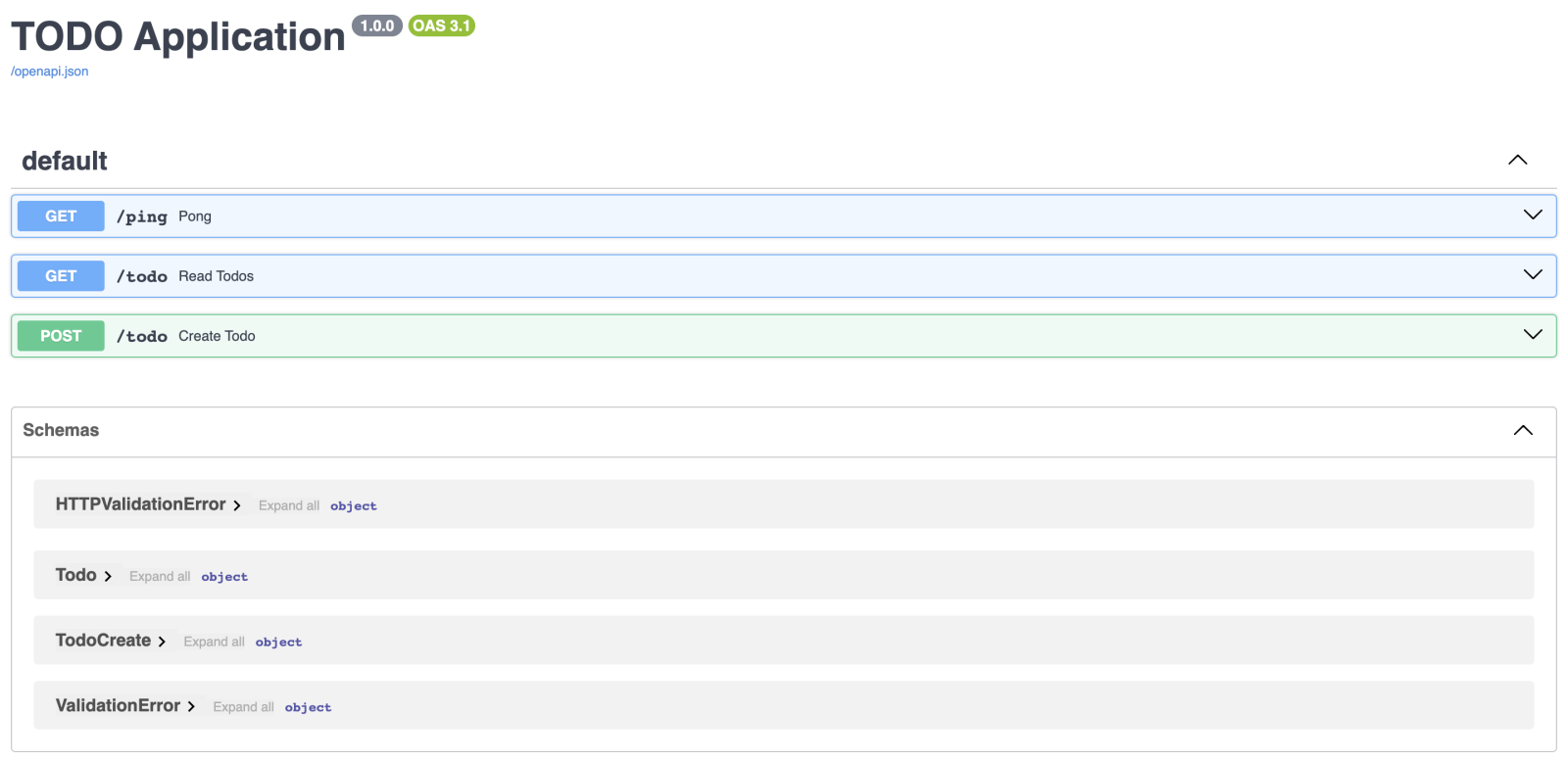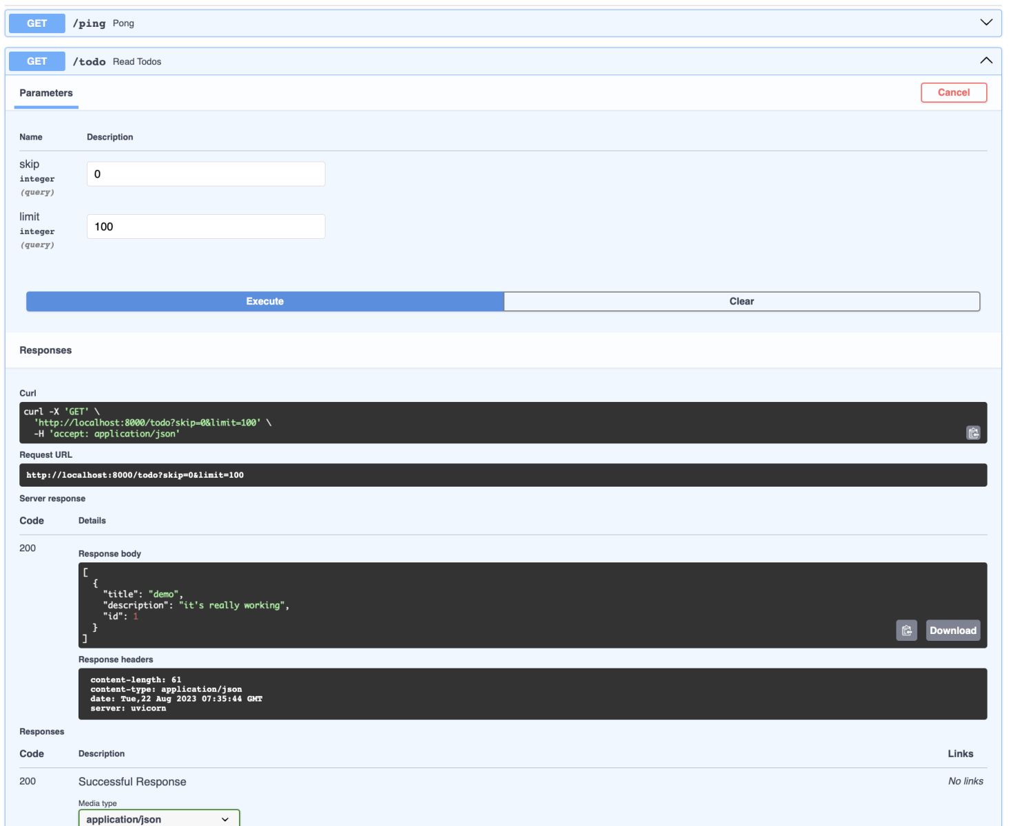 from fastapi import FastAPI, Depends from .db import init_db, get_session from . import crud, schemas app = FastAPI( title= 'TODO Application' , version= '1.0.0' , ) @app.on_event("startup") def on_startup () : init_db() @app.get("/ping") async def pong () : return { "ping" : "pong!" } @app.get("/todo", response_model=list[schemas.Todo]) async def read_todos (skip: int = 0 , limit: int = 100 , session=Depends (get_session) ) : todos = crud.get_todos(session, skip=skip, limit=limit) return todos @app.post("/todo", response_model=schemas.Todo) async def create_todo (todo: schemas.TodoCreate, session=Depends (get_session) ) : return crud.create_todo(db=session, todo=todo)文档页面已相应更新,现在我们可以使用它了