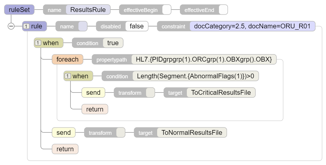 第 4 步:如果設置了異常標誌,我們將從“ResultsDTRule”業務規則中轉換消息並將消息再次發送到“ResultsRule”業務規則以將消息發送到“ToCriticalResultsFile”操作,否則將發送到“ToCriticalResultsFile”操作: