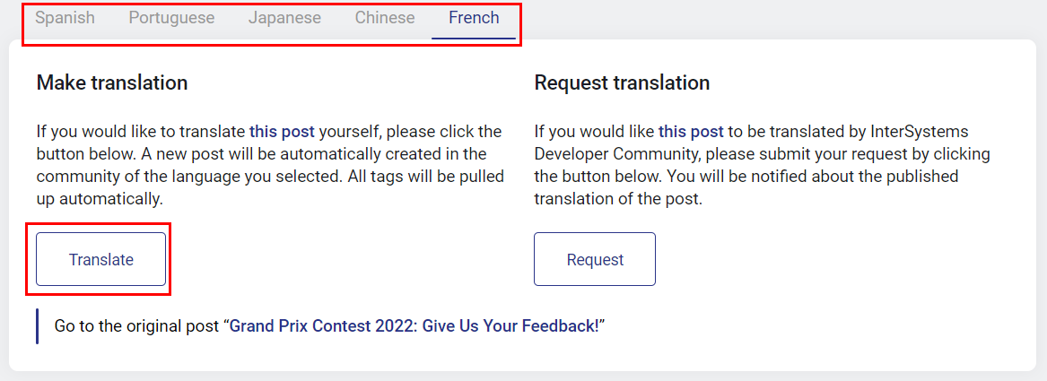 在我们的开发者社区中,你可以很容易地将原始文章和不同语言的翻译版连接起来并发布在不同语言的社区中(或者是“请求翻译”)。