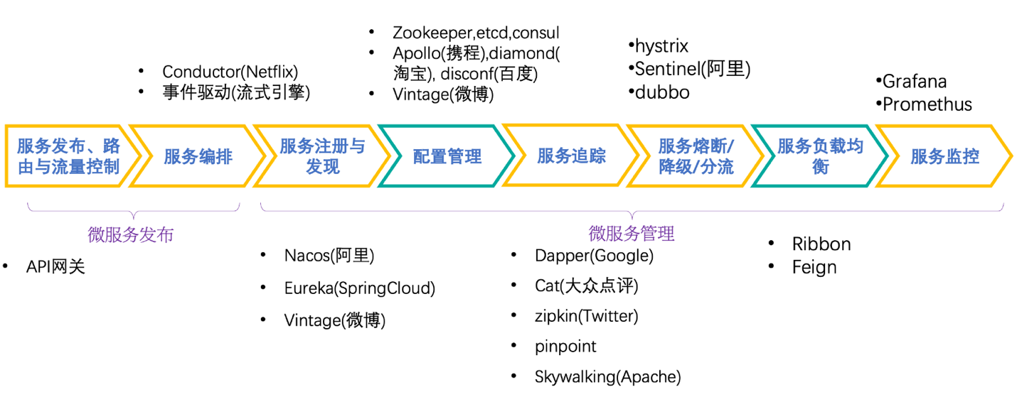 下图列出了目前市面上对上述微服务管理能力的一些流行的开源技术产品,可以一窥其复杂程度。