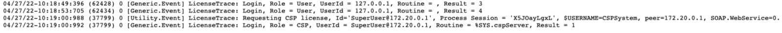 您可以在 messages.log 中启用licenses使用跟踪。 启用跟踪时,每个licenses登录或注销都会跟踪到 messages.log,标识进程、操作(登录或注销)、角色(用户、CSP、诊断)以及成功或失败(非零连接计数或失败为零 )。