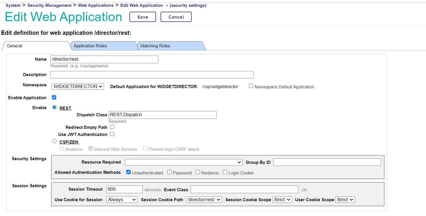 现在,我们需要在“安全”>“应用程序”下创建一个 Web 应用程序。这应该设置为 REST 类型的应用程序,并且 Dispatch Classname 应设置为我们刚刚创建的 REST.Dispatch 类(注意,您需要向该应用程序授予适当的安全角色,以便它可以访问代码和数据)。保存后,现在可以从您定义的 URL 调用 REST 服务