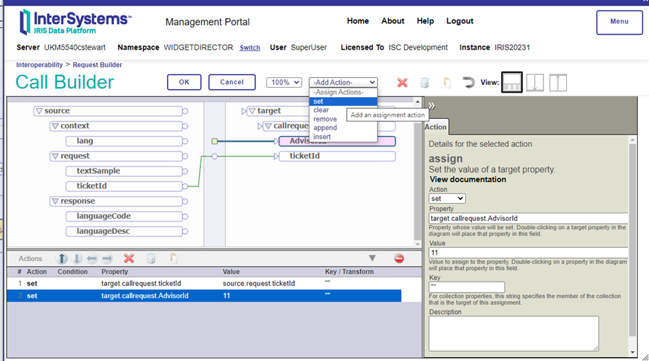 Mme Francis 的用户 ID 为 11,因此我们设置 Call 对象以向 FrenchAdvisor 服务提供 AdvisorUpdate 消息,并使用请求构建器传递 TicketID 和 Advisor 参数的固定值 11