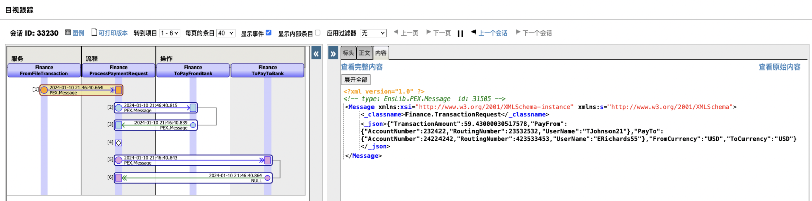 ToCurrency:USD启动Production后,可以将测试数据文件copy到业务服务监听到文件夹下。如果成功,应该可以看到这样的消息追踪结果,可以看到,用Java开发的PEX组件运行结果和IRIS自带的组件没有区别: