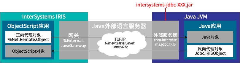 作为多种Java访问方式的基础,InterSystems IRIS的Java外部语言服务器的架构如下: