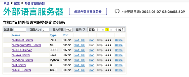 InterSystems IRIS端提供并管理包括Java语言服务器在内的一系列外部语言服务器。注意,一般情况下,使用系统开箱的这些外部服务器就够了,不需要额外建立额外的Java语言服务器。而且,也无需事先启动,外部语言服务器会在调用时自动启动。