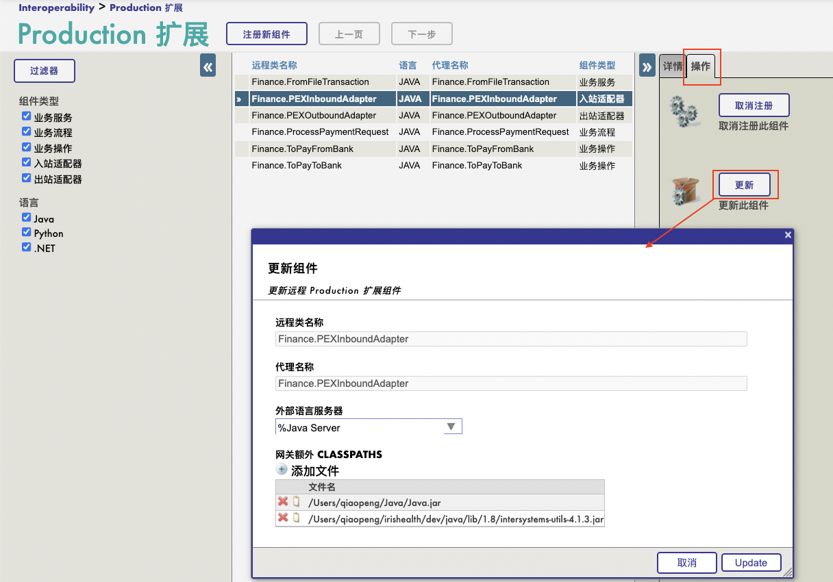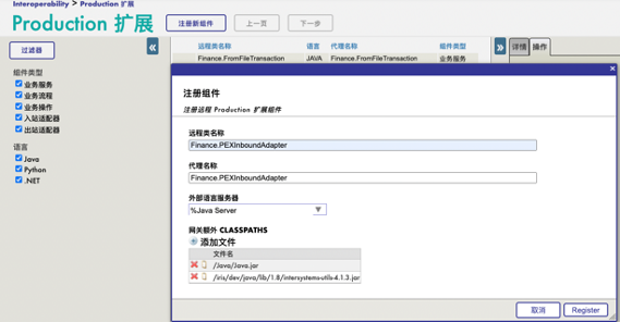 将这些Java开发的组件组册后,就可以像InterSystems IRIS的本地组件一样使用了。我们将业务操作、业务流程和业务服务依次加入到Production,并配置好相应的配置项: