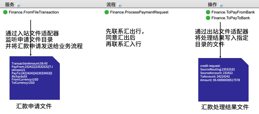- 业务服务(Finance.FromFileTransaction)监听特定文件夹,并从新汇款申请文件中解析出汇款请求,发送给业务流程(Finance.ProcessPaymentRequest);
