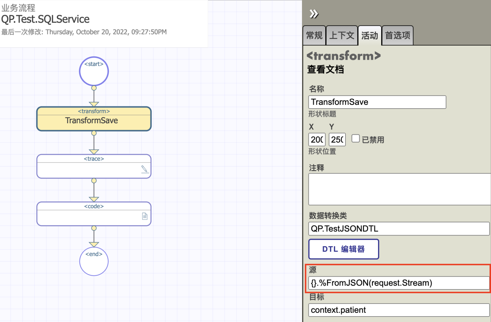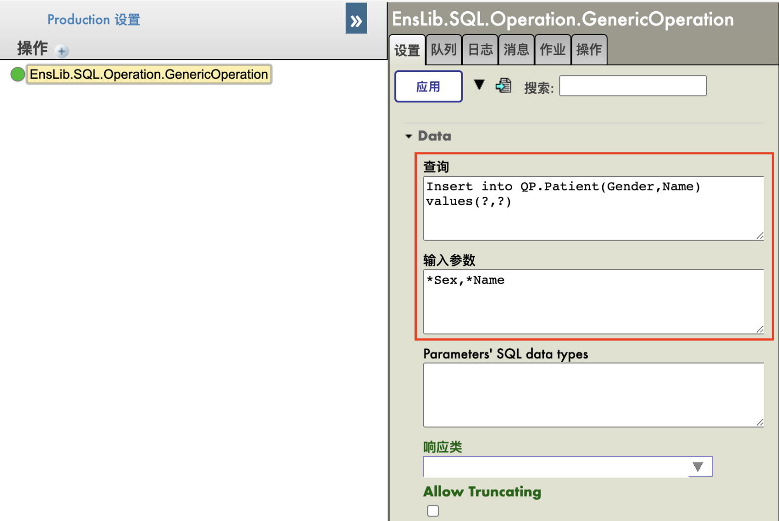 Insert into QP.Patient(Gender,Name) values(?,?)如果SQL需要输入参数,在 输入参数 中按顺序添加需要的参数,一般情况下是使用请求消息里的属性,在需要用的属性名前面加 *,说明这个参数来自请求消息。例如*Sex,*Name。