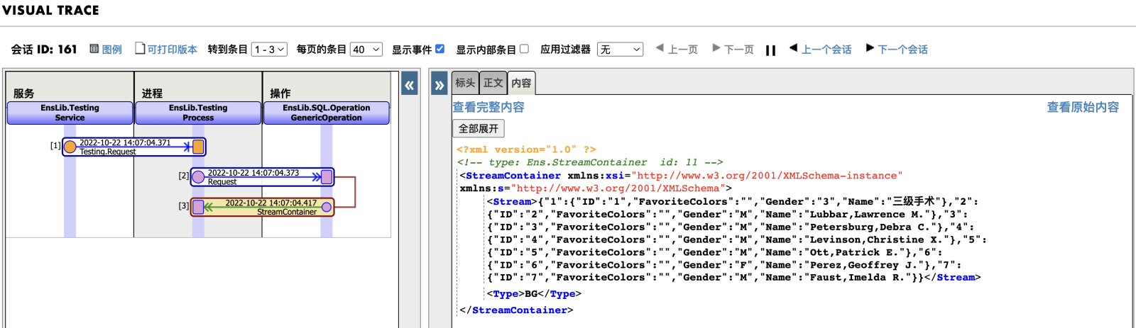 默认是Ens.StreamContainer,而结果集数据是以JSON表达并放在其Stream属性(流类型)下的,正好用到JSON免schema的特性。类似于: