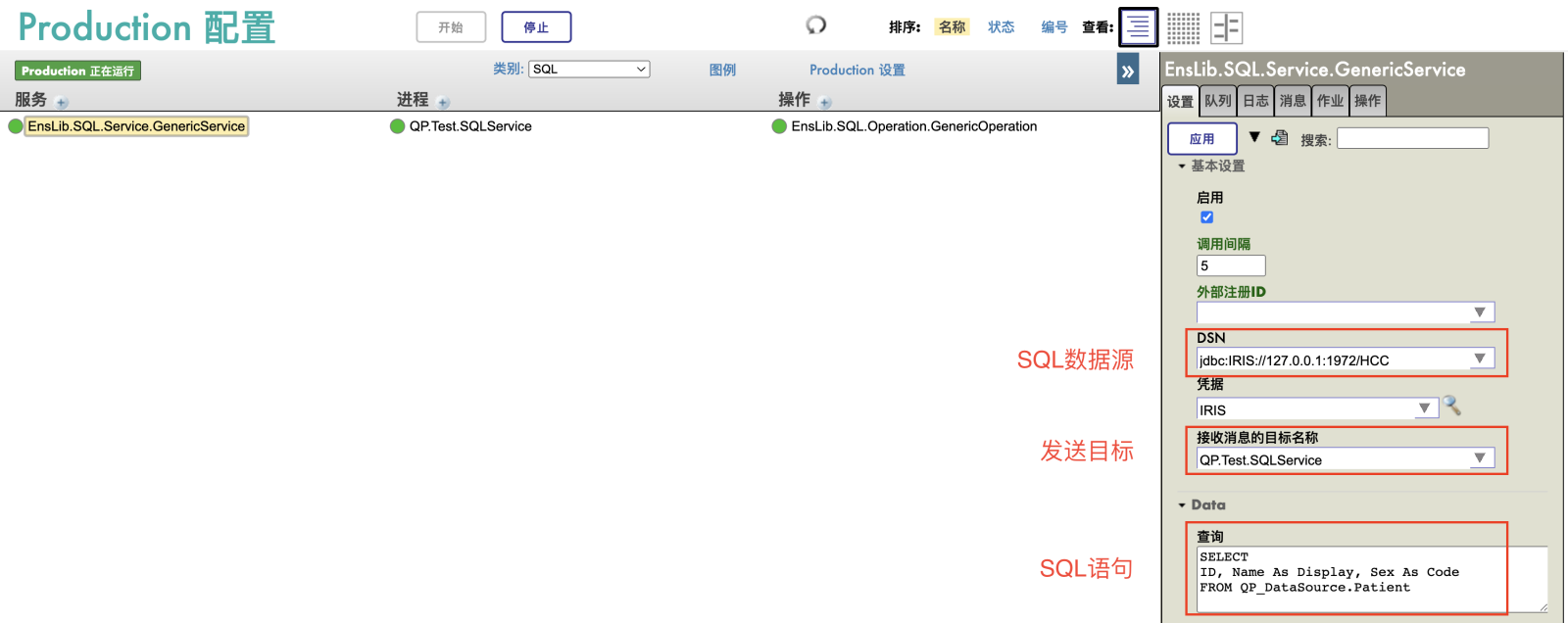 直接将EnsLib.SQL.Service.GenericService或EnsLib.SQL.Service.ProcService加入Production的BS中,并设置数据源、SQL语句和发送目标: