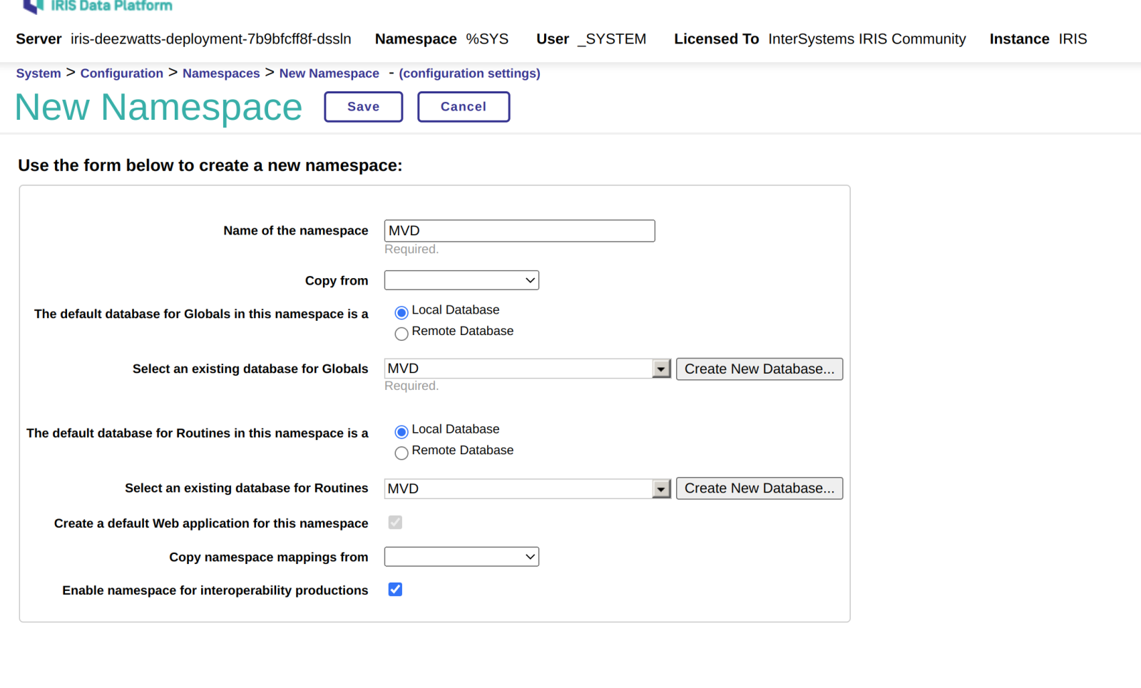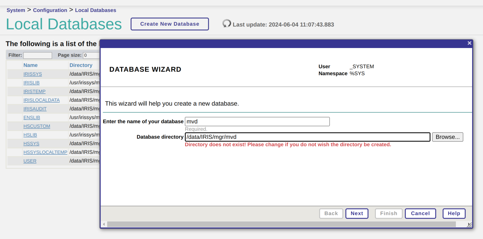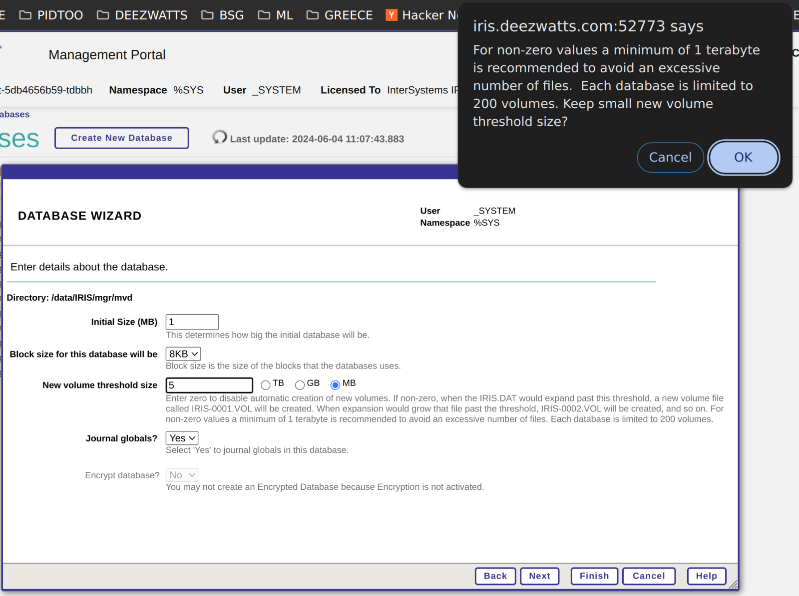 为了将IRIS.DAT 中的空间耗尽,我新建了一个命名空间使用该数据库: