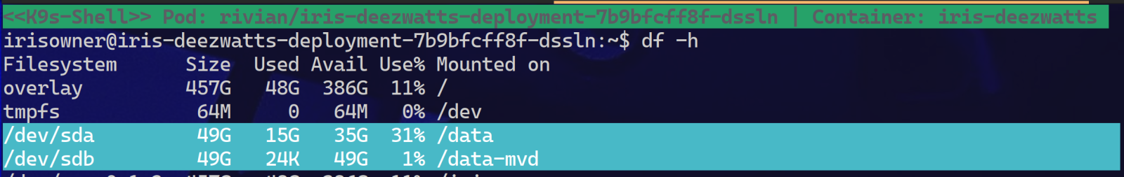 我在 2024.1 (Build 263U) 上有一个正在运行的IRIS实例,我的 $ISC_DATA_DIRECTORY 设置为一个 50Gi 的OpenEBS PVC,这是大概一个月前配置的。