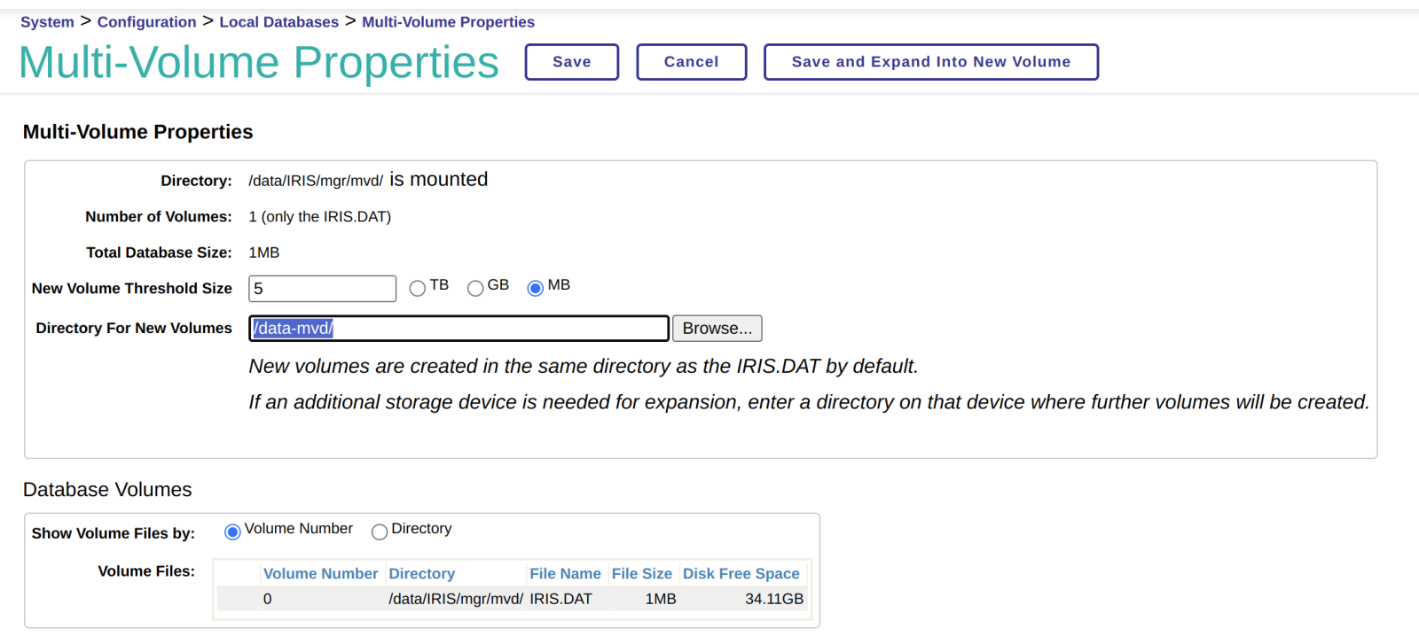 输入值为零则禁用新卷的自动创建。 如果不为零,当 IRIS.DAT 大小达到到此阈值时,将创建名为 IRIS-0001.VOL 的新数据库文件。 当新数据库文件再次达到阈值时,将创建 IRIS-0002.VOL文件,依此类推。 对于非零值,建议至少设置为 1 TB,以避免文件数量过多。 每个数据库被限制为最多扩展使用200 个数据库文件。