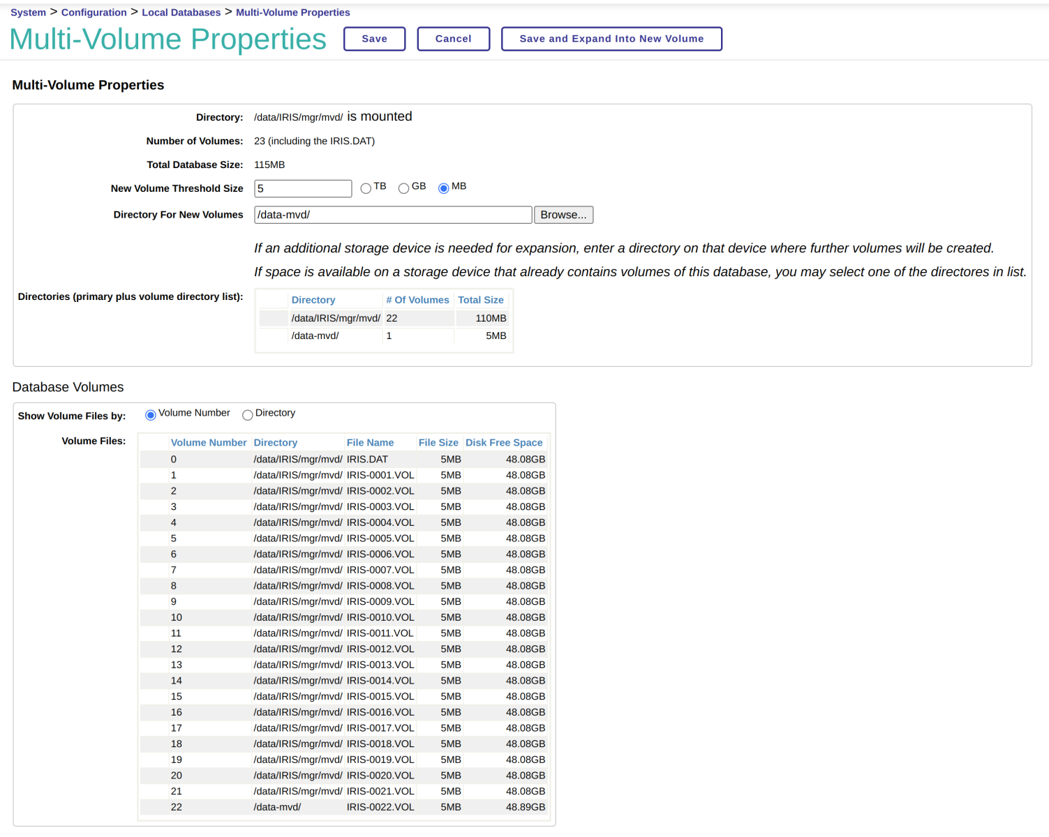 在InterSystems IRIS的默认配置中,数据库会使用单个 IRIS.DAT 文件保存数据。 你也可以将数据库配置为在当其达到指定大小阈值时自动保存到另外的文件(IRIS–0001.VOL、IRIS–0002.VOL 等等)中。 这些文件可能位于与 IRIS.DAT 相同的目录中和/或一组其他的目录中。