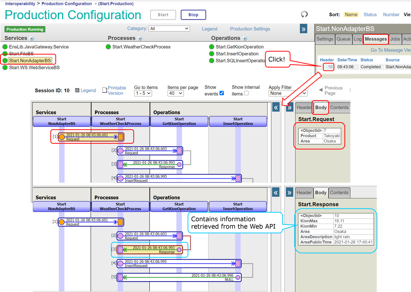 首先,让我们使用Production示例来启动Production,并在检查配置的同时通过查询数据来检查消息处理的流程。