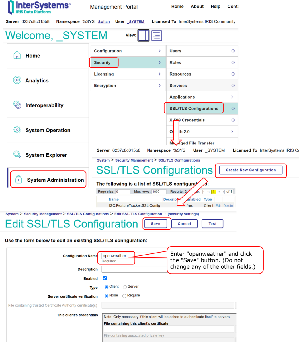 单击管理门户 > [系统管理] > [安全] > [SSL/TLS 配置] > [新建配置] 按钮,在“配置名称”字段中输入“openweather”,然后单击“保存”按钮 结束。