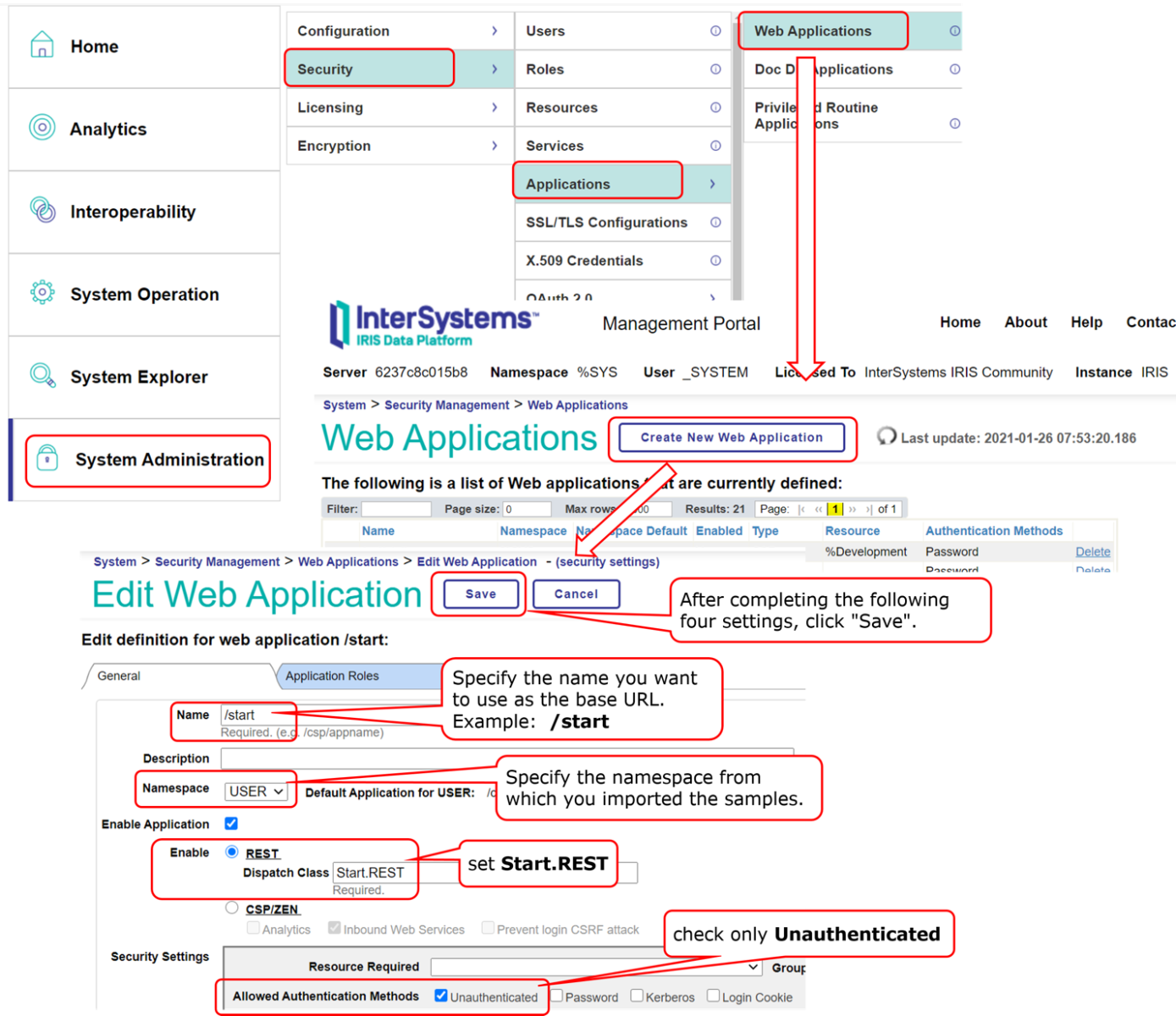 在名称字段中,指定 /start 在命名空间字段中,指定从中导入样本的命名空间; Dispatch Class 字段中,指定 Start.REST 在允许的身份验证方法字段中,选择Unauthenticated,然后保存文件。