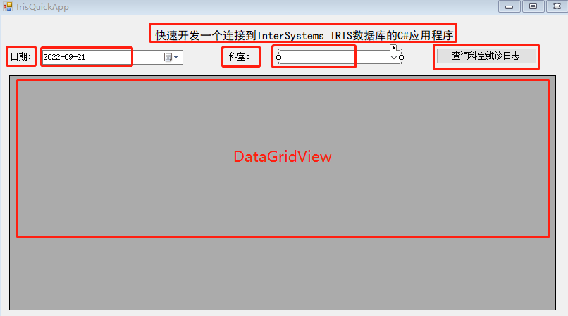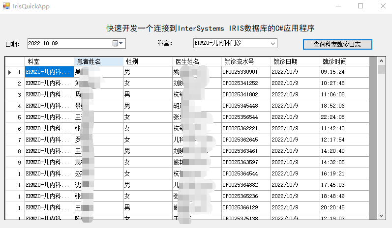 10、最后双击窗体中的“查询科室日志”按钮,在按钮点击事件函数中,添加通过SQL语句查询IRIS数据库的代码,并通过DataGridView的DataSource属性将SQL语句的查询结果绑定到DataGridView数据网格视图。完成后,再次运行项目,可以实现通过选择日期和科室,查询指定日期和科室的就诊日志。