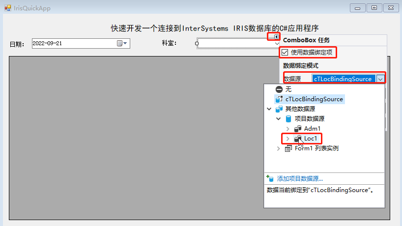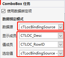 8、选中ComboBox下拉列表选择框控件,点击控件中右上角出现的箭头,弹出ComboBox数据绑定窗口,勾选“使用数据绑定项”,之后选择6中添加的数据集Loc1,设置“显示成员”为“科室名称”字段,“值成员”为“科室ID”字段,“选定值”为“科室ID”,上述操作便完成了ComboBox控件直接使用数据集的设置。