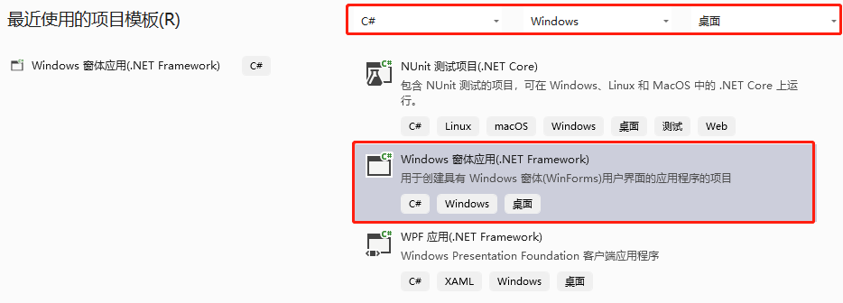 4、打开Microsoft Visual Studio 2019,选择“文件”->“新建”->“项目” ,在弹出的创建新项目窗口中,选择C#语言、Windows窗体应用。