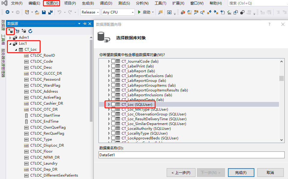 6、在本例子中,将介绍两种数据库查询操作方式,其一为常见使用SQL语句的方式,其二为添加数据集的方式,添加数据集的操作如下:从菜单栏选择“视图”->“其他窗口”->“数据源”,在“数据源”视图中点击“添加新数据源”,选择数据库后,可以为数据集添加绑定数据库的表,如为本例中Loc1(科室)数据集成功添加绑定CT_Loc表后,可以在可视化视图中查看数据表数据,并可以被Form可视化窗体中添加的控件直接使用。