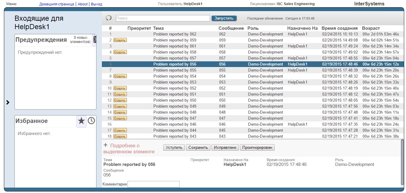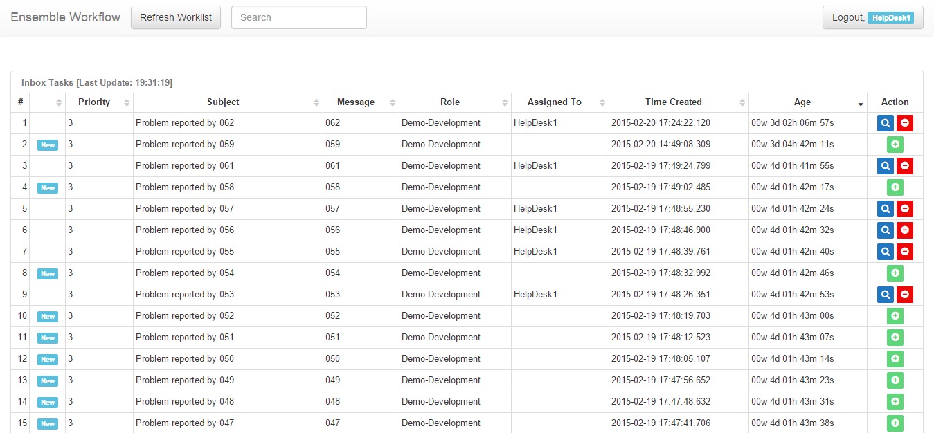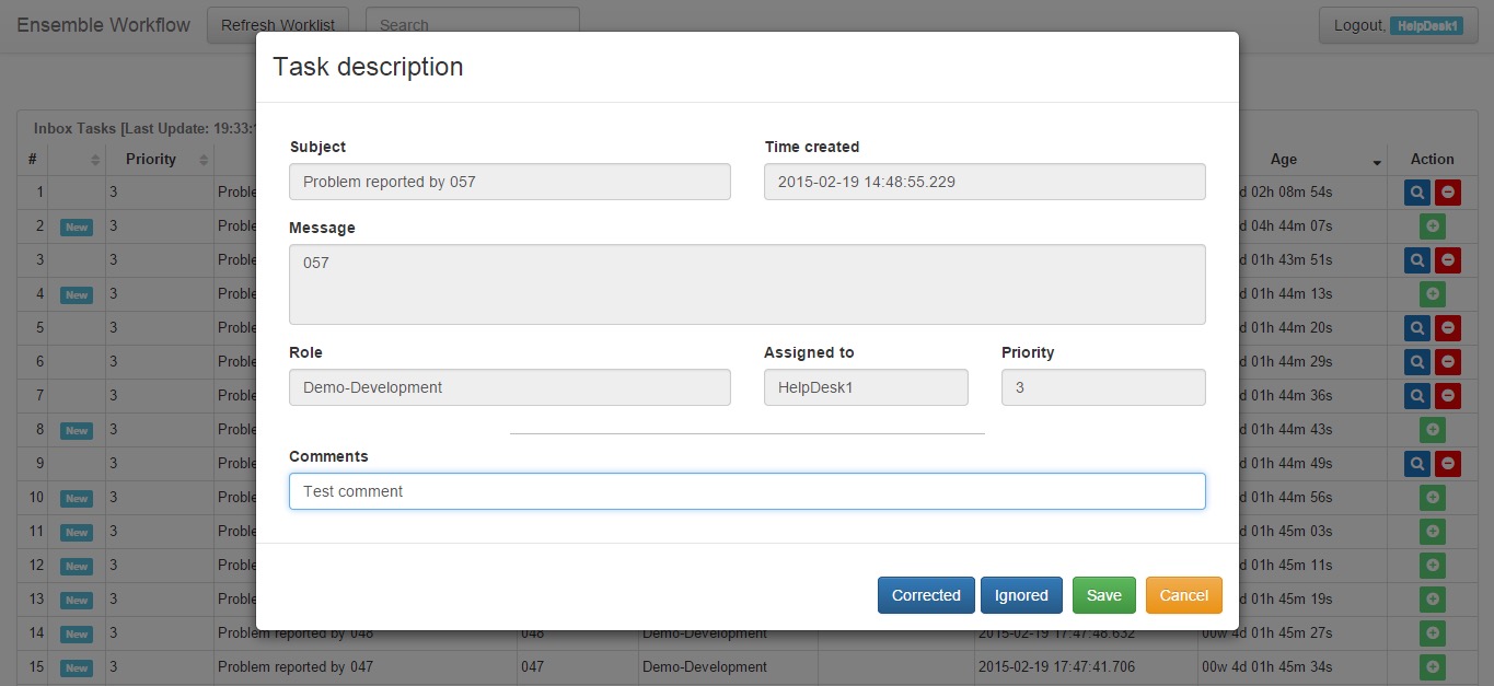 业务流程使用 EnsLib.Workflow.TaskRequest 类的消息向具有 Demo-Development 角色的用户发送任务,该类定义了所有可能的操作(“Fixed”或“Ignored”)以及“Comment”字段。 消息的正文还包含有关错误和报告错误的用户的信息。 在此之后,相应的任务会出现在每个具有演示开发角色的用户的工作流门户中。