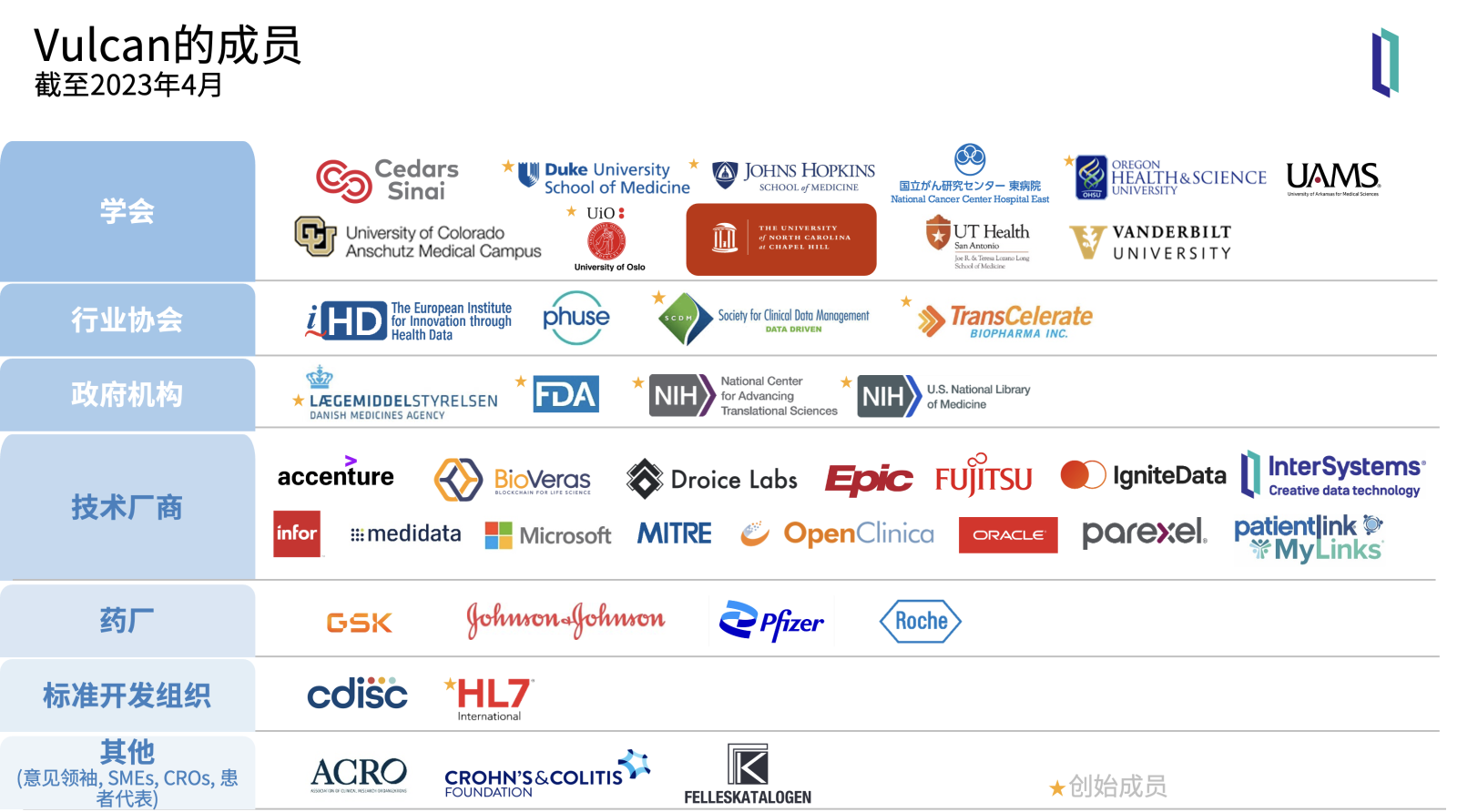 例如Vulcan是专注连接临床研究、转化研究和医疗保健的加速器,它的成员不仅有HL7这样的标准开发组织,还有学会 - 例如约翰霍普金斯医学院,行业协会 - 例如全球医疗数据科学社区PHUSE,政府机构 - 例如FDA,技术厂商 - 例如InterSystems,药厂 - 例如GSK,甚至意见领袖。