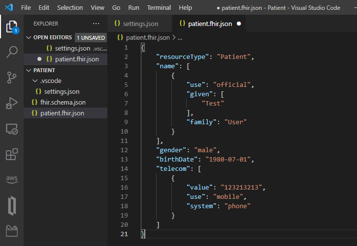 第 4 步: 在同一文件夹中创建一个新文件patient.fhir.json。