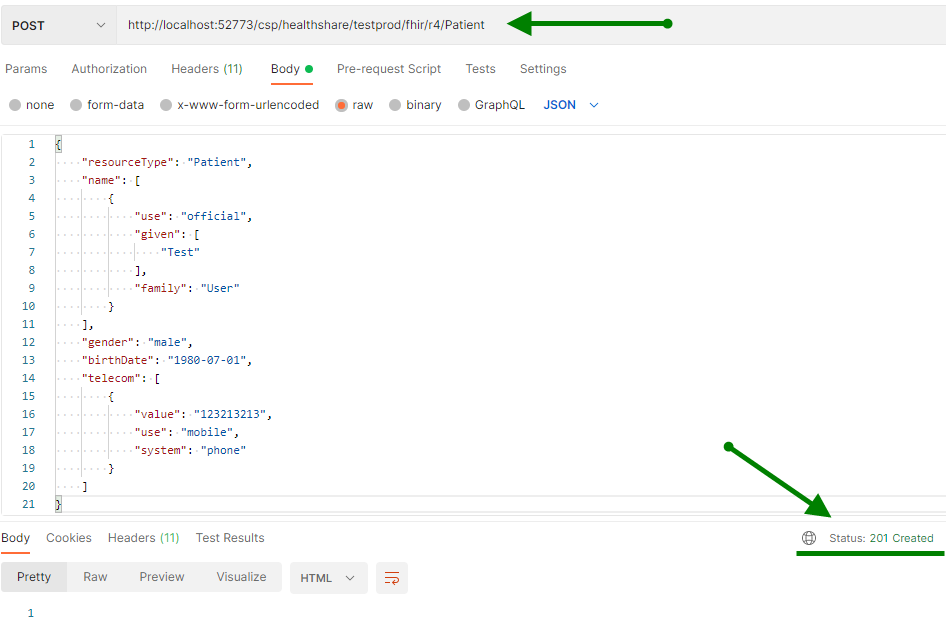 第 5 步: 使用Postman的Rest API在InterSystems FHIR服务器上发布创建资源。